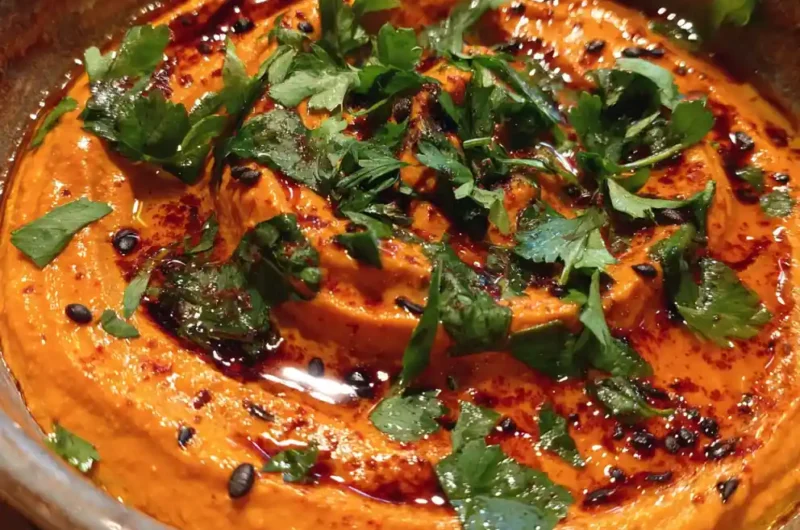Looking for a vibrant and flavorful dip that’s both easy to make and incredibly satisfying? This Roasted Red Pepper & Smoked Cumin Spicy Dip with Olive Oil Swirl is a guaranteed crowd-pleaser! The sweetness of roasted red peppers is beautifully balanced by the smoky warmth of cumin and a touch of heat from harissa paste. A swirl of fragrant cumin-infused olive oil and a sprinkle of fresh cilantro elevate this dip to something truly special. Perfect for parties, gatherings, or a cozy night in, this dip is incredibly versatile and pairs wonderfully with pita chips, veggie sticks, or warm flatbread. Let’s get started on creating this delicious appetizer!