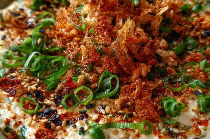 6. Serve and Garnish: Remove cream cheese from the refrigerator 10-15 minutes before serving for easy spreading. Transfer to a bowl, create a swirl on the surface, then generously sprinkle the toasted sesame-togarashi mixture over the center and scatter reserved scallion tops around the edges.