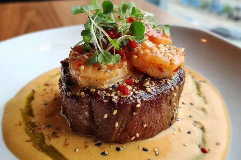 Indulge in a luxurious Seared Filet Mignon with succulent shrimp and a vibrant Yuzu-Lime Lobster Cream Sauce. This dish balances rich flavors with bright citrus notes for an unforgettable dining experience.