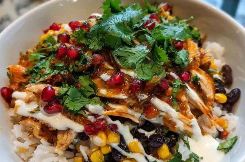 - Assemble Bowl: Layer rice, beans, chicken, crema, and salsa; garnish with cilantro and pomegranate.