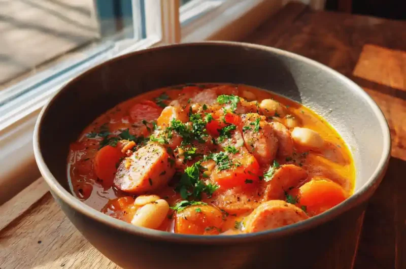This Smoky Red Pepper Cream Swirl Chicken Sausage & White Bean Soup is a comforting and flavorful meal, perfect for a chilly evening. It features a smoky paprika and roasted red pepper base with a creamy swirl for added elegance.