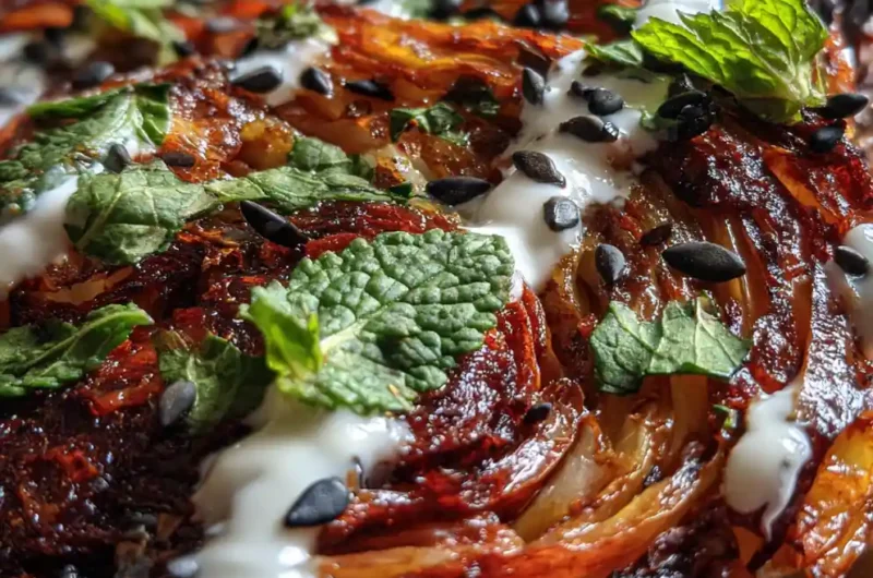 - To plate, spoon the smoky harissa cabbage into a rustic ceramic bowl. Drizzle generously with the prepared minted yogurt, then scatter the remaining fresh mint leaves and a sprinkle of nigella seeds over the top for a vibrant contrast in color and texture.