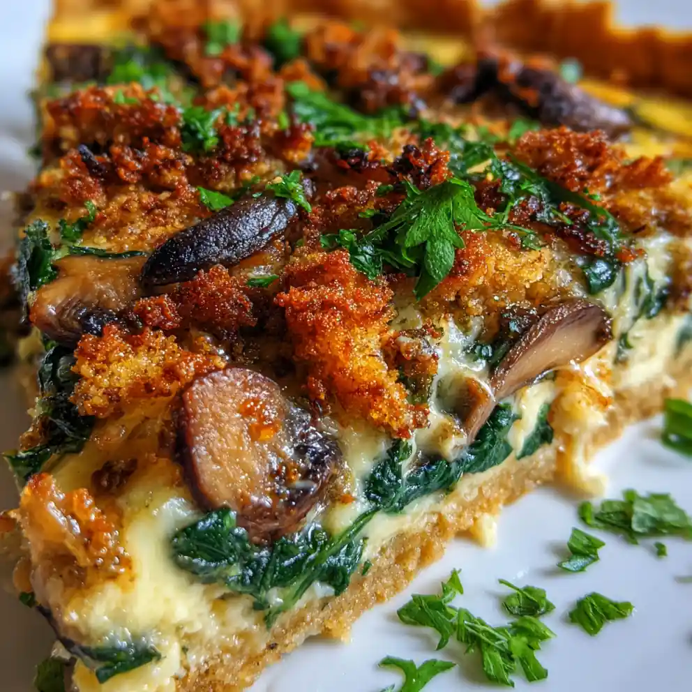 This easy spinach mushroom quiche features a golden-brown crumble topping and a creamy, savory filling, making it a perfect hearty and healthy option for weeknight dinners.
