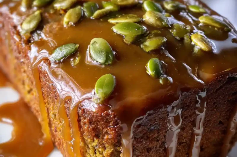- Glaze and Serve: Once the loaf is completely cool, pour the glaze over the top and sprinkle with candied pepitas. Slice and serve.