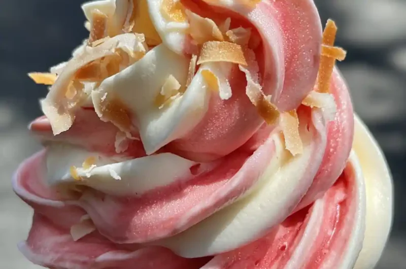 5. Swirl and Serve: Immediately scoop the vibrant strawberry dole whip into individual chilled serving bowls or glasses. Dollop spoonfuls of the prepared lime-coconut cream into the dole whip base and gently swirl it in for a marbled effect.
