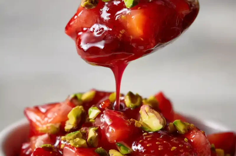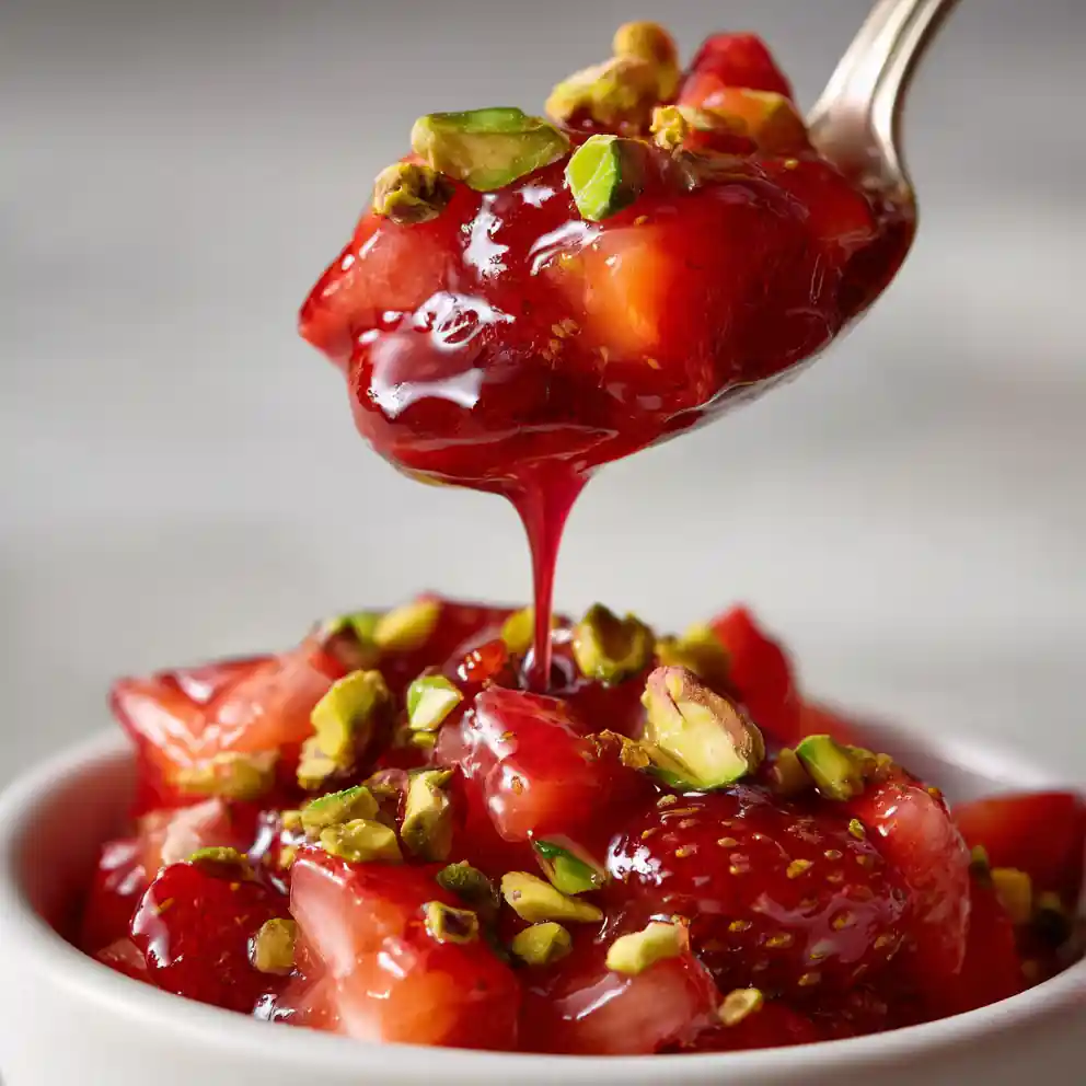 - Toast Pistachios & Garnish: To prepare the garnish, spread 40 g (¼ cup) shelled pistachios in a single layer on a dry skillet. Toast over medium heat for 3-5 minutes, stirring frequently, until fragrant and lightly golden. Immediately transfer to a plate to cool, then coarsely chop. Serve the vibrant ruby-red strawberry filling generously topped with these coarsely chopped, toasted green pistachios for a striking color and texture contrast.