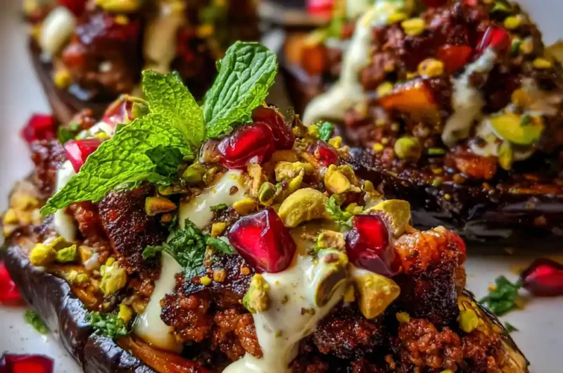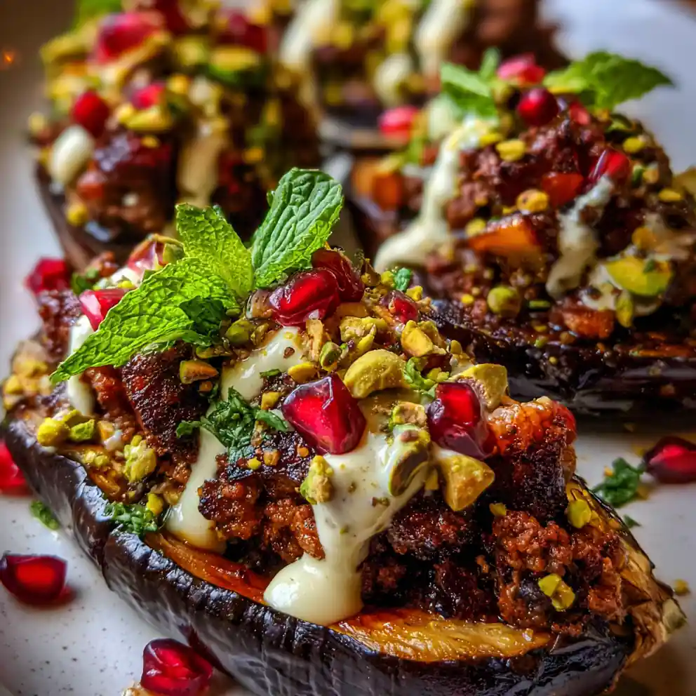 - Serve: Carefully transfer two stuffed eggplants onto a warm plate. Drizzle the Lemon-Tahini Drizzle over the top. Sprinkle generously with toasted pistachios, vibrant pomegranate arils, and fresh mint leaves for a beautiful finish.