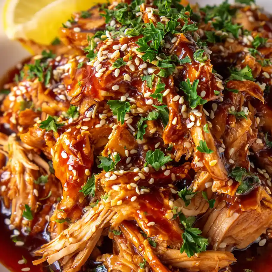 8. Plate and Garnish: Warm a shallow white porcelain plate. Smear a thin line of any remaining sauce diagonally across the plate. Mound the shredded chicken in the center, drizzle a small circle of extra sauce around the mound, and then scatter chopped fresh parsley and toasted sesame seeds evenly over the top. Optionally, add a lemon wedge to the rim for a bright visual contrast.