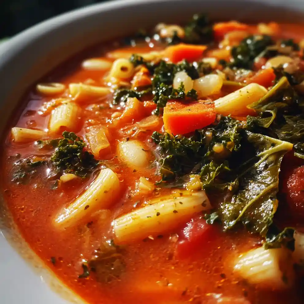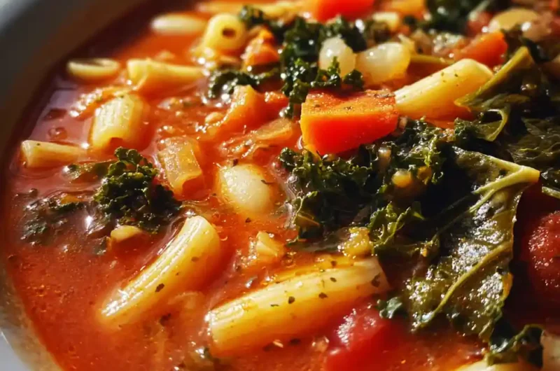 A traditional minestrone soup featuring a rich tomato broth with green kale, perfect for a warming, satisfying, and versatile one-pot meal. It’s simple enough for weeknights yet packed with robust, family-friendly flavors.