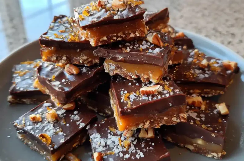 - Drizzle and Garnish: Once the praline slab is chilled, drizzle the melted orange-infused chocolate over it in a zig-zag pattern. Immediately sprinkle with toasted orange zest and a light pinch of flaky sea salt.